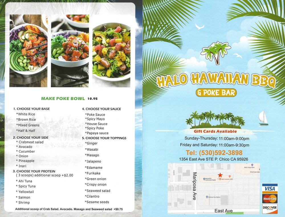 Introducing Halo Hawaiian BBQ & Poke Bar, a casual dining spot in Chico, CA, offering a variety of Hawaiian BBQ and Poke options. With a menu packed full of delicious dishes like coconut shrimp, chicken katsu, poke bowls, and spam musubi, there's something for everyone to enjoy. Customers rave about the generous portion sizes and the flavorful coconut sauce that accompanies the dishes. The friendly staff provides quick service, making dining here a pleasant experience. If you're looking for a satisfying meal that won't break the bank, Halo Hawaiian BBQ & Poke Bar is the place to visit. Don't miss out on their mouth-watering seafood and BBQ combo plates, perfect for lunch or dinner. With options for takeout, delivery, and catering, Halo Hawaiian BBQ & Poke Bar is a go-to spot for delicious Hawaiian cuisine.